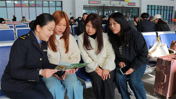 作为边境铁路枢纽,高铁珲春站还立足区位特色,深化“石榴花”党内服务品牌,配备专业翻译终端,编制多语种服务手册,为中外旅客搭建无障碍沟通桥梁。工作人员也化身“旅游推荐官”,为游客推介珲春游玩攻略、特色美食,联动地方交通部门优化公铁接驳。刚下高铁收到宣传单的安图游客姜先生说:“听了工作人员的介绍,我准备好好规划一下,在珲春多玩几天,领略候鸟迁徙的壮阔景观。”