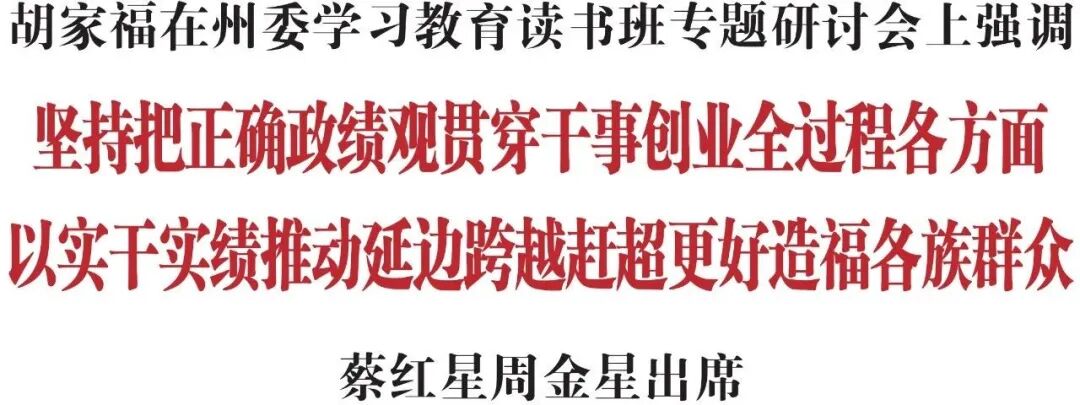 4月3日,省委常委、州委书记胡家福主持召开州委学习教育读书班专题研讨会。他强调,要深入学习贯彻习近平总书记关于树立和践行正确政绩观的重要论述,牢牢把握“立党为公、为民造福、科学决策、真抓实干”总要求,坚持把正确政绩观贯穿干事创业全过程、各方面,以实干实绩推动延边跨越赶超、更好造福各族群众。州人大常委会主任蔡红星、州政协主席周金星出席会议。