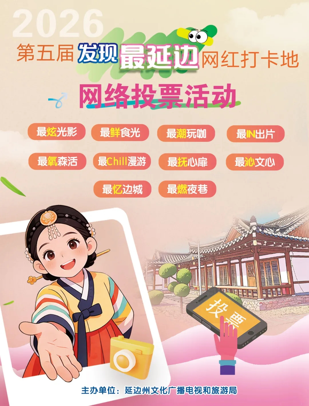 由延边州文化广播电视和旅游局主办的第五届“发现最延边”网红打卡地评选活动——网络投票通道将于4月9日18时全面开启。