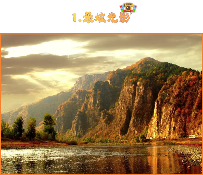中朝边境日光山云海,登顶后视野开阔,晨昏时界河日出与边境晚霞交相辉映,静谧中尽览中朝风光。