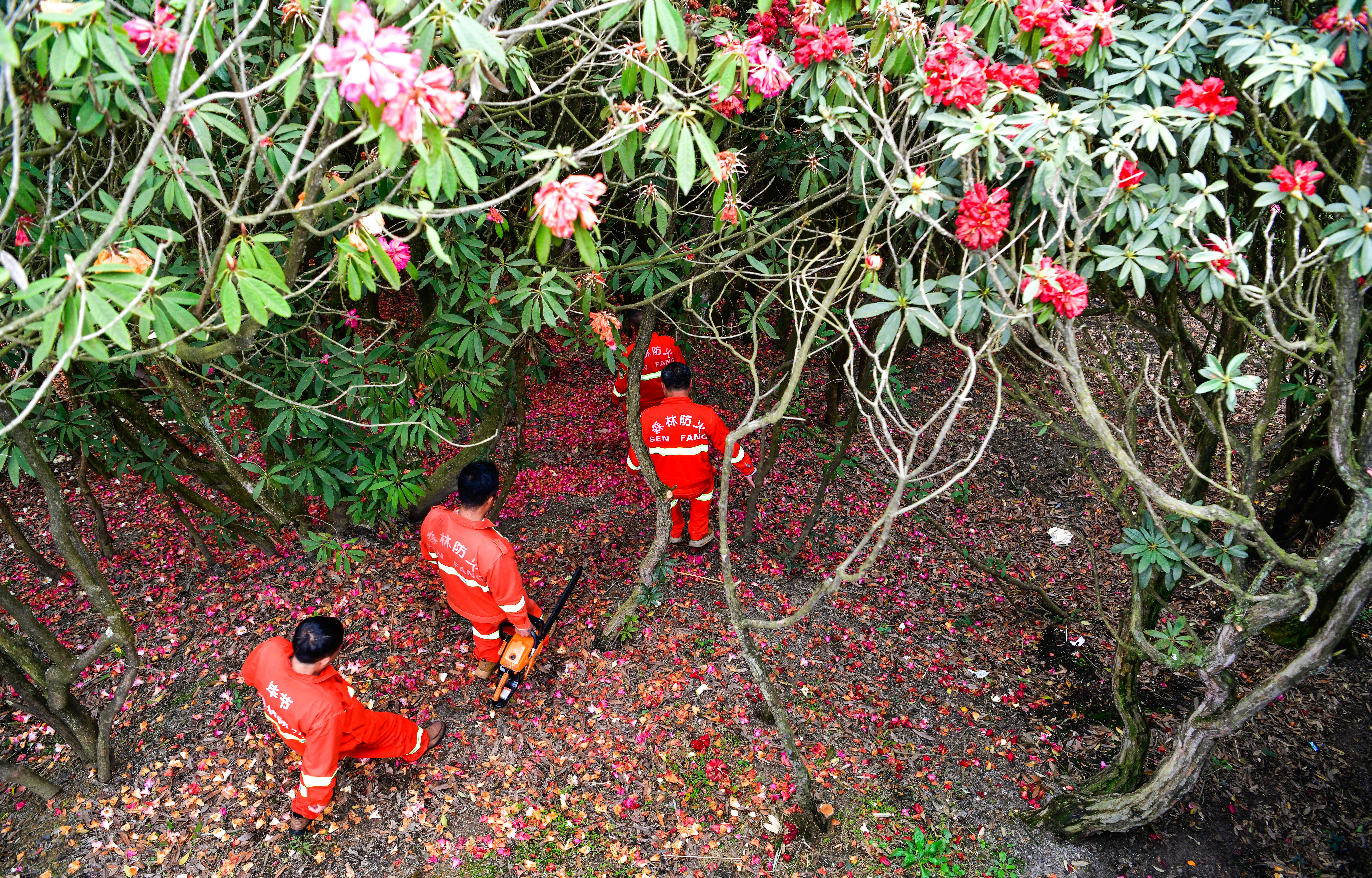 从2008年以来,百里杜鹃管理区管委会常年聘请专职森林防火队员45人,负责林区火灾隐患排查、森林病虫害防治、制止盗挖盗采等工作。18年来,无论风吹雨淋,严寒酷暑,森林防火队员们每天在林海山间值守巡查,在有“地球彩带,世界花园”之称的景区守护杜鹃花开。