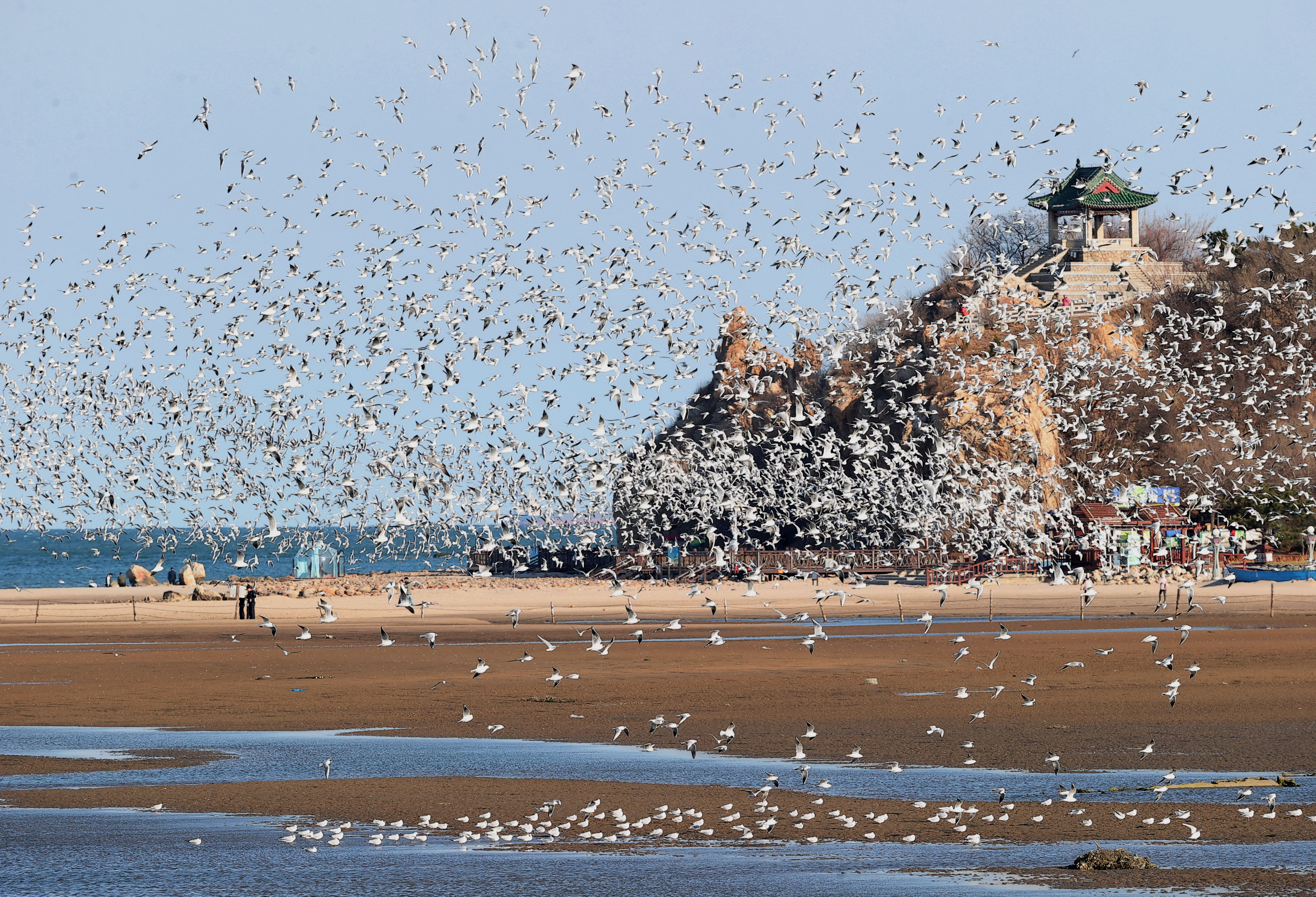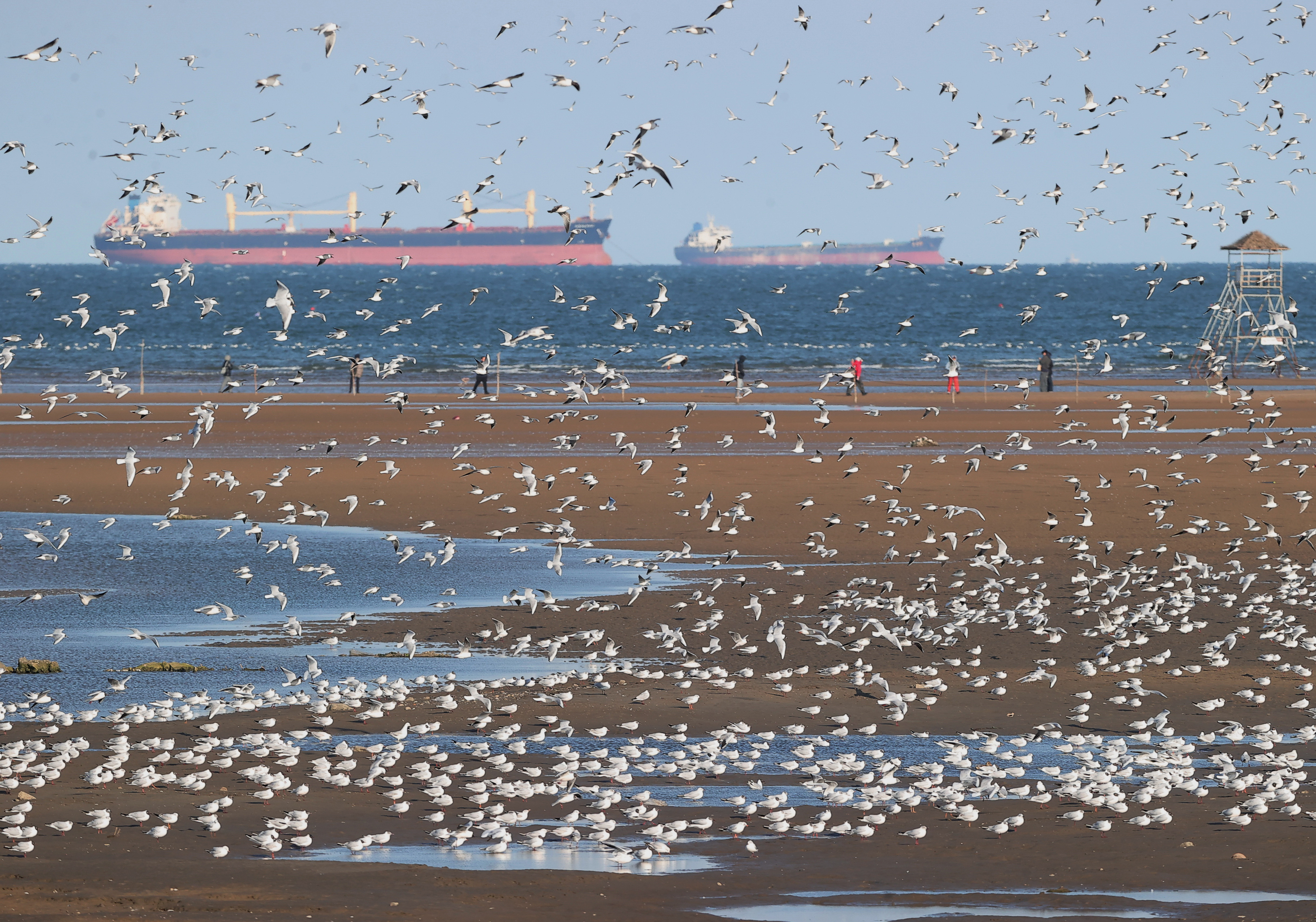 近日,大批海鸥聚集于河北省秦皇岛市北戴河区沿海地区,在蓝天碧海间起舞。