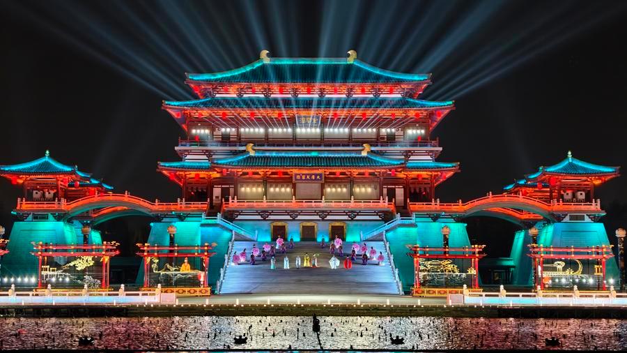 大型沉浸式水舞光影秀《大唐追梦》在西安大唐芙蓉园上演。新华社发