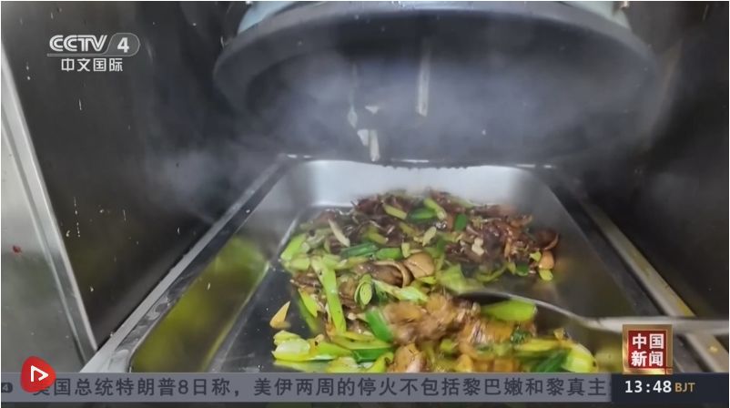 在北京东城的一处胡同片区,这家AI食堂近期人气很高。炒菜机器人犹如经验丰富的大厨,自动热锅、淋油,依次投入葱姜蒜、肉片、辣椒等食材,并精准添加调料,不到3分钟,可供50人食用的一锅小炒肉便出锅了。两台AI炒菜机器人,两名厨师,便能从容应对200多人的就餐高峰。盛春玲老两口就是这家食堂的常客。每天中午一到饭点,两位老人就会早早来到这里,看看食堂又做了什么好吃的。