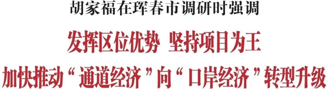 调研中,胡家福指出,珲春市区位优势明显、开放平台集聚、优惠政策叠加,是延边州乃至吉林省对外开放的“桥头堡”。要开足马力推进项目建设,严格落实领导包联、常态调度等工作机制,对未开工项目要逐项梳理症结、加快手续办理,对在建项目要加大投资强度、加快施工进度,对进度缓慢项目要找准堵点卡点、集中力量攻坚,确保项目建设周周有变化、月月有进展。要坚持不懈壮大实体经济,积极承接发达地区产业转移,加紧招引落地一批实力雄厚、技术领先的优质企业,布局更多投资体量大、综合效益好的制造业项目,培育壮大新能源、新医药、新装备等战略性新兴产业,促进服务业优质高效发展,形成更多新的经济增长点。要千方百计扩大外贸规模,加快口岸基础设施改造升级,加大力度引进煤炭、液化石油气、液化天然气、铜精矿等战略资源,扩大木材、粮食、整车、二手车等进出口规模,大力发展冷冻海鲜、肉类食品、中药材等进口资源落地加工产业,做大做强“跨境电商+市场采购+互市贸易”融合业态,不断推动对外贸易提质增效。要久久为功做热文旅市场,加快打造套娃酒店、龙原里特色街区等文旅新场景,利用VR、全息投影等前沿技术赋能渤海古镇、哇斯托克欢乐岛、东北虎豹自然科普馆等景区景点,推动欧式街、海鲜街等特色街区发展潮流零售、蜜月旅拍等多元业态,依托吴大澂收复国土纪念馆、大荒沟党史教育基地等场馆开展红色研学、教育培训,下大力气提升入境旅游便利化水平,让客流“涌进来”、人气“旺起来”、市场“热起来”,加快把文旅流量转化为消费增量。