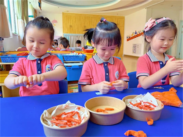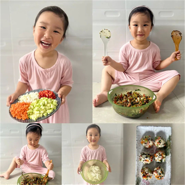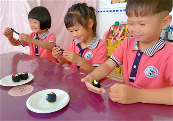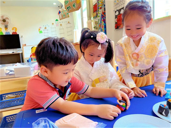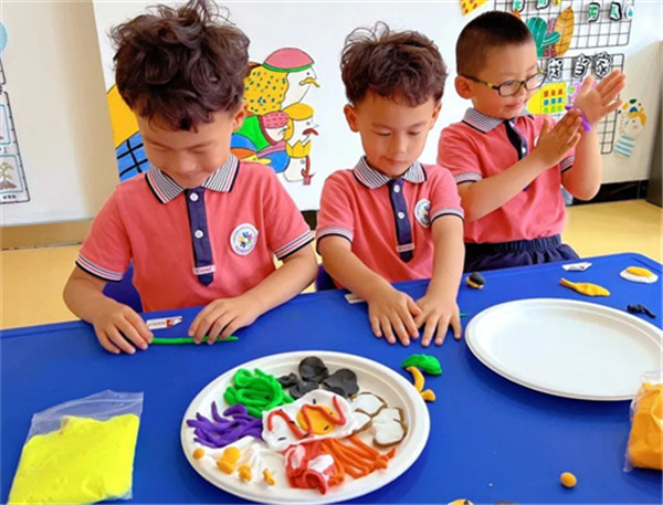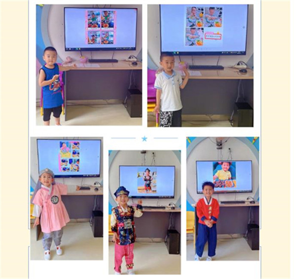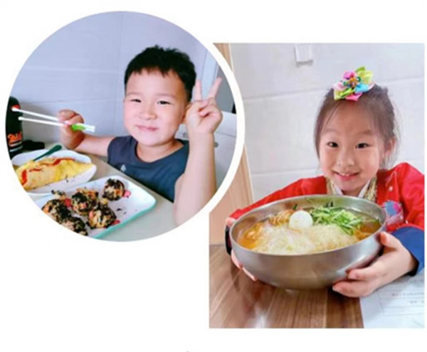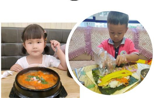 搓圆、捏扁、压长……孩子们积极投入到美食制作中,七彩的轻泥在他们的巧手中变成了营养美味的拌饭、劲道爽滑的“冷面”、色香味俱全的“紫菜卷”……一份份色香味俱佳的“美食”,让人垂涎三尺。“我们延边的美食可真多”“我最爱吃冰爽的冷面啦”……孩子们用充满童真和质朴的话语表达着对家乡的祝福和喜爱,流露出对家乡的无限热爱。
